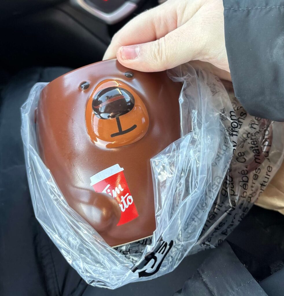 このクマさんの手にティムホートンズのコーヒーカップを抱えていて、よく見ると、クマさんの鼻は、コーヒービーンズです。